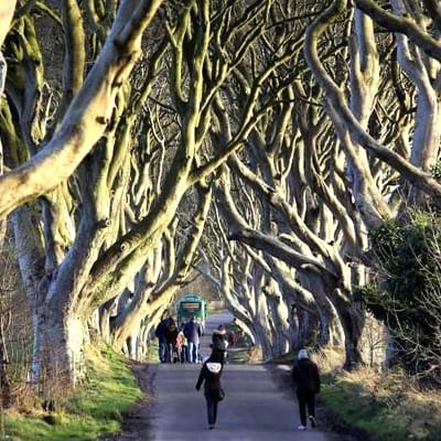 Start your morning early and drive to the Dark Hedges to avoid tourist crowds. The picturesque Dark Hedges tree tunnel, formed by the overhanging and intertwined branches of beech trees that line either side. This is the location chosen for the scene of Arya's nail-biting escape from King's Landing.